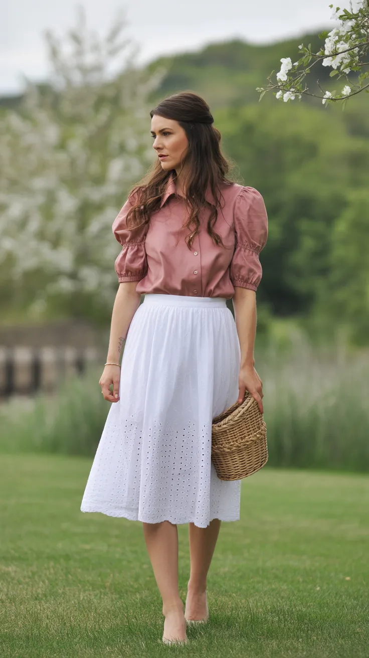This outfit combines a lovely white eyelet skirt with a soft dusty rose blouse, creating a fresh and effortless look perfect for a garden party wedding. The eyelet detail on the skirt adds a touch of charm, making it a great choice for an English garden wedding guest outfit.