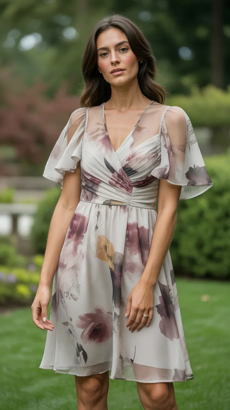The dress has a flattering silhouette with flutter sleeves and a cinched waist, creating a lovely skirt outfit for wedding guests. The flowy design allows for easy movement, making it ideal for dancing and mingling at a garden party wedding.