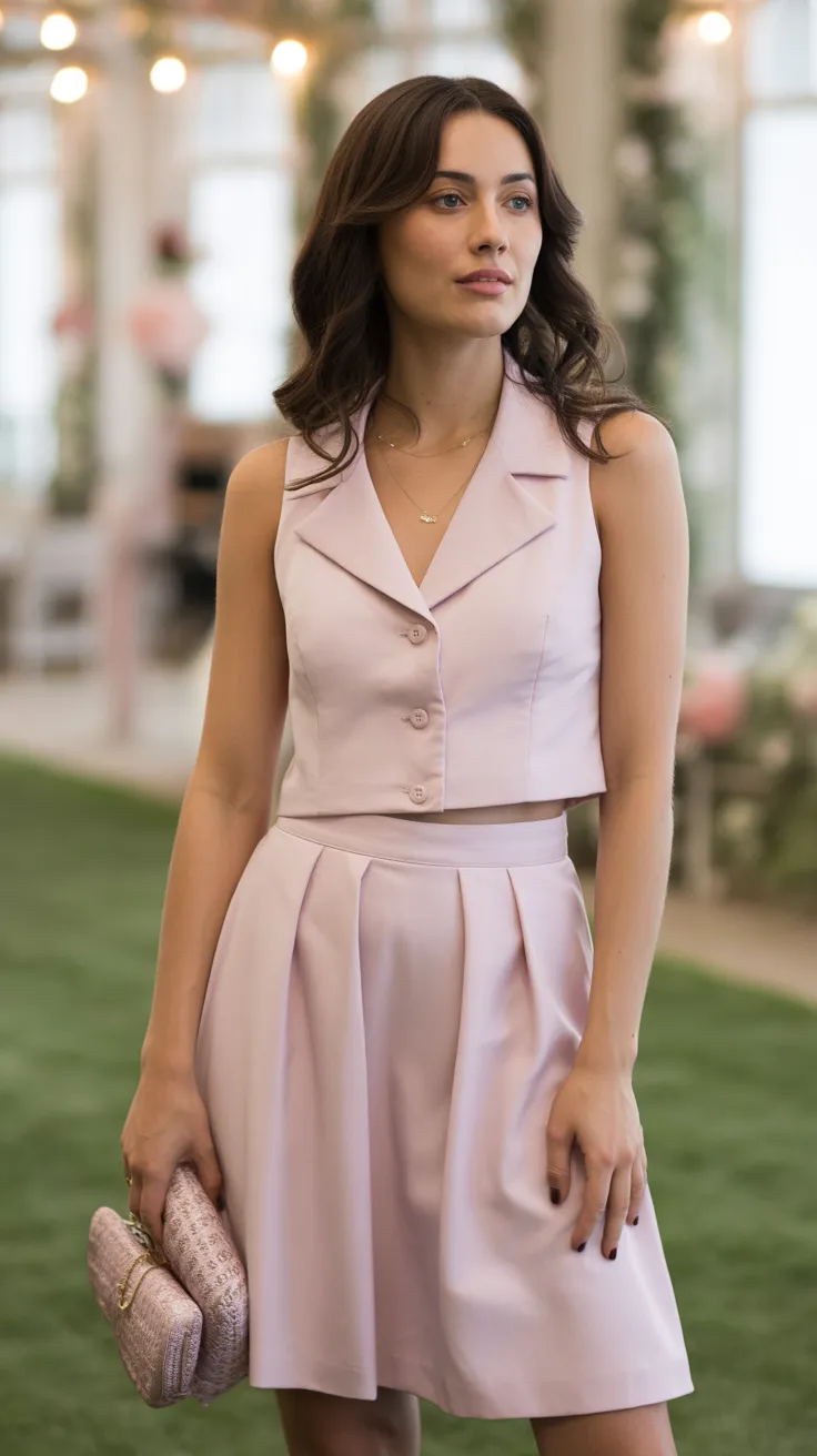 This pastel skirt set is a perfect choice for a garden party wedding. The soft pink skirt flows gracefully, creating a lovely silhouette that feels both fresh and effortless. Paired with a simple sleeveless blouse, this outfit strikes a balance between casual and formal, making it ideal for an English garden wedding guest outfit.