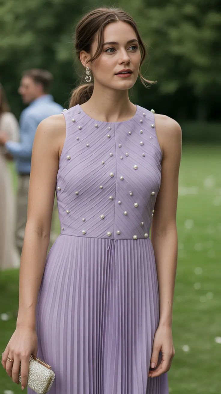 The lilac pleated dress is a stunning choice for a garden party wedding. Its soft color and delicate pleats create a charming look that feels fresh and effortless. The pearl details add a touch of sophistication, making it perfect for a wedding guest outfit.