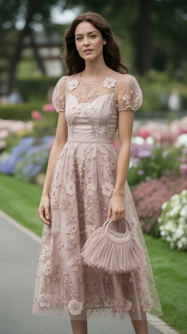 Don’t forget to consider the setting. The dress complements the lush greenery and floral arrangements typical of a garden party. It’s a beautiful choice that captures the essence of a lovely outdoor celebration.