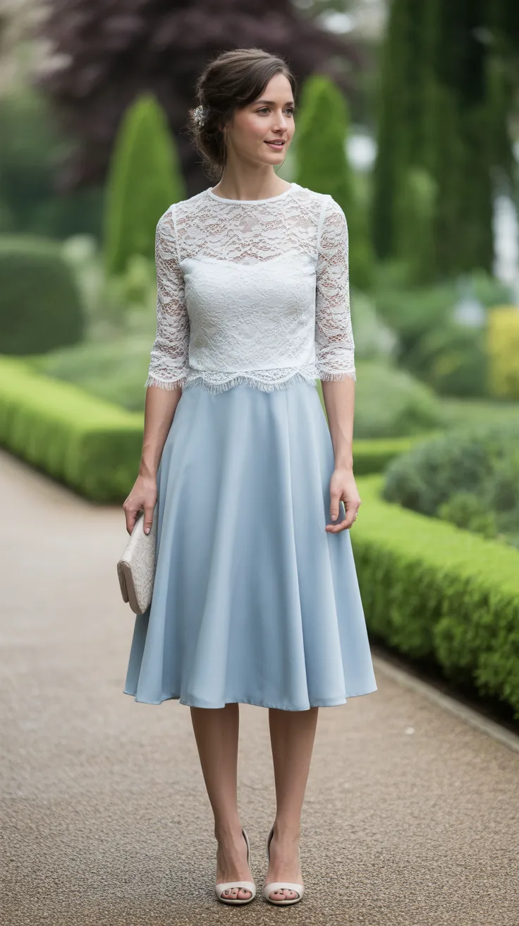 This outfit perfectly captures the essence of a garden party wedding. The white lace top adds a touch of romance, while the soft blue midi skirt brings a refreshing vibe. Together, they create a look that feels both effortless and polished.