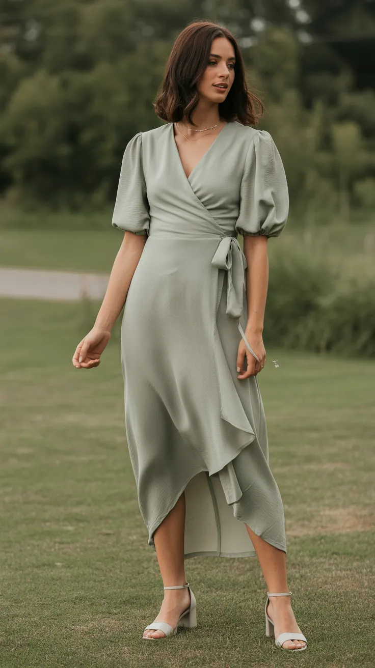 The sage green wrap dress is a stunning choice for a garden party wedding. Its soft hue blends beautifully with the natural surroundings, making it perfect for an English garden wedding guest outfit. The wrap style flatters various body types, offering both comfort and style.