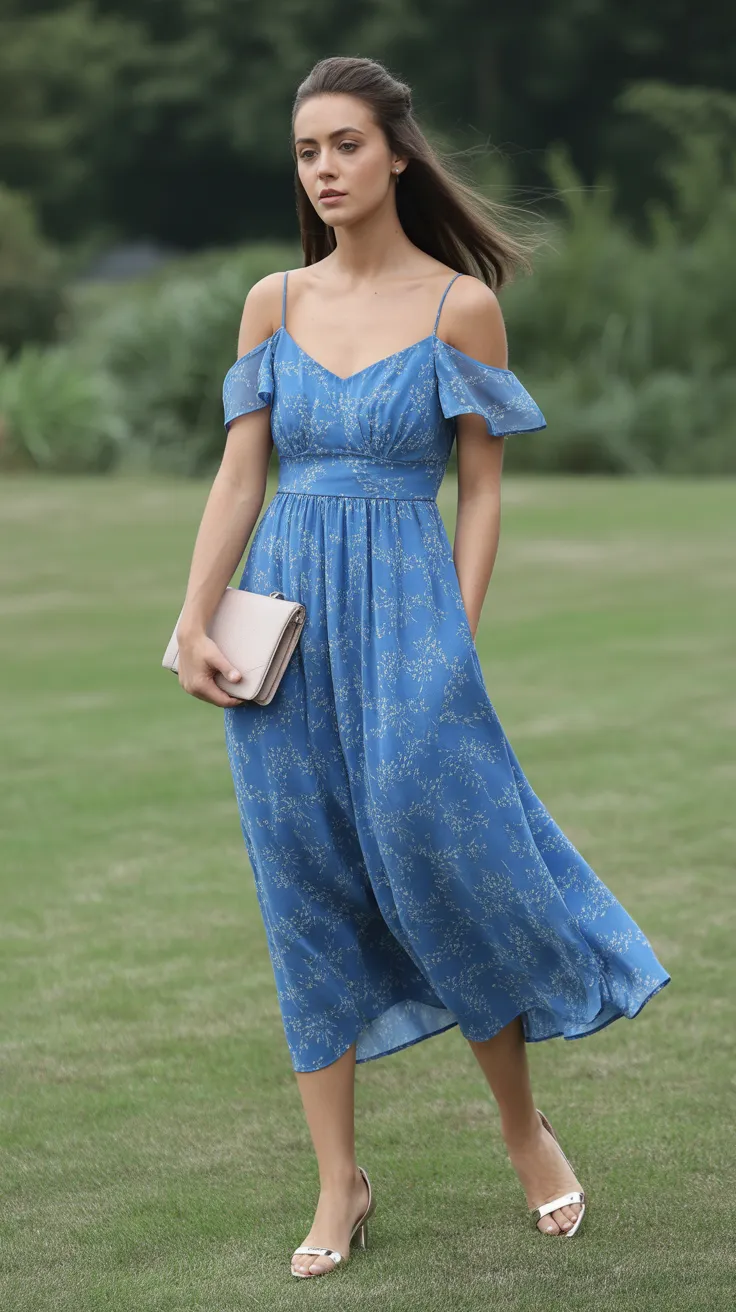 This stunning blue off-shoulder midi dress is perfect for a garden party wedding. The soft fabric and floral print create a fresh and inviting look. The off-shoulder design adds a touch of romance, making it an ideal choice for a wedding guest outfit.