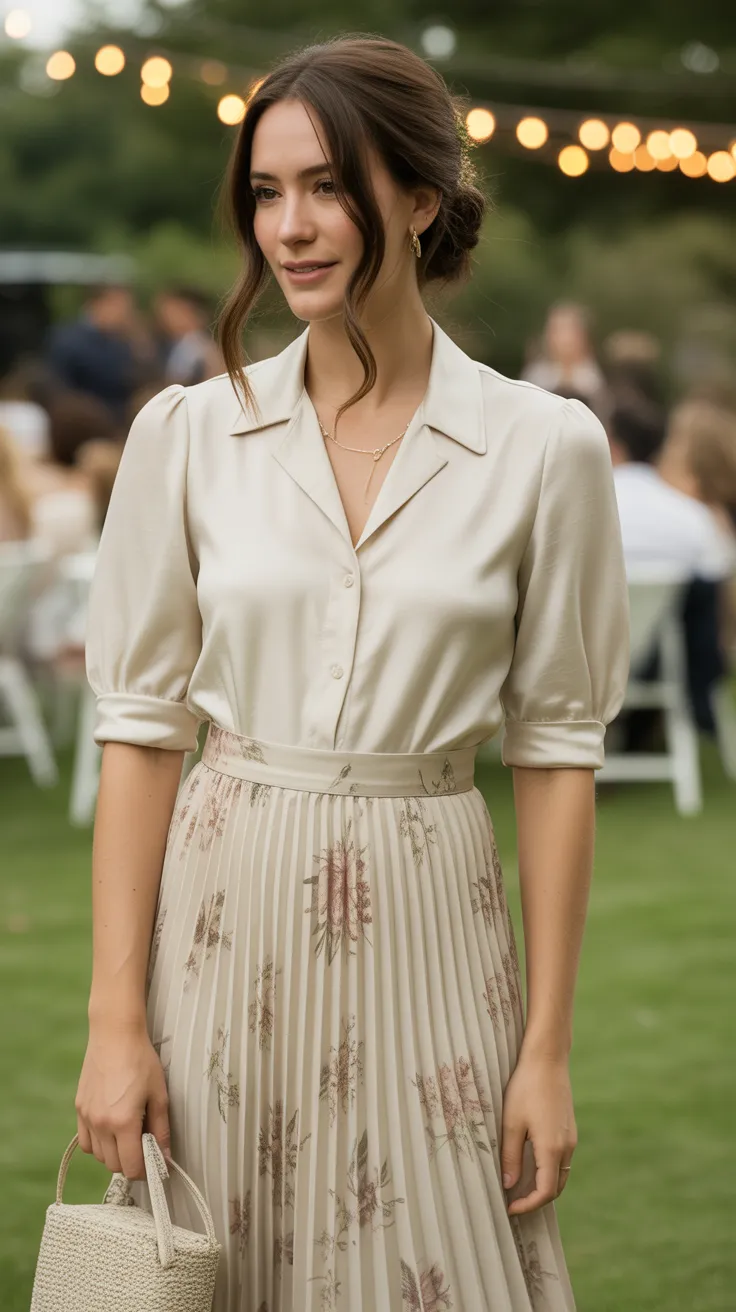 The light colors and airy fabric are perfect for outdoor events, allowing you to stay comfortable while looking chic. The skirt’s pleats add a touch of sophistication, while the blouse keeps the look relaxed. This combination is a great option for anyone searching for a garden party wedding outfit guest that feels stylish yet approachable.