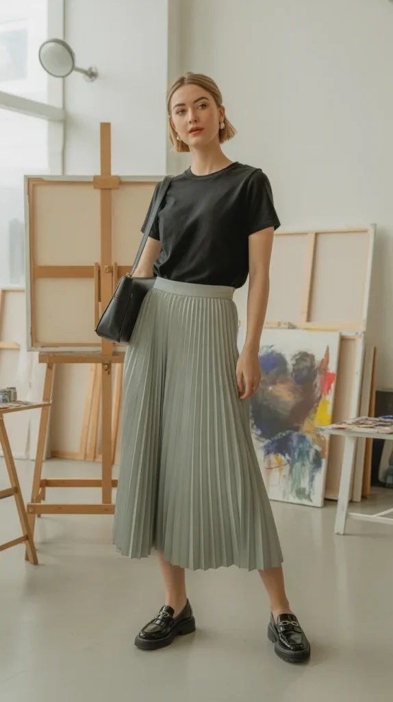 Minimalist but never boring the pleats add movement and the black tee keeps the look grounded. Black loafers make it feel modern and effortless. A sleek shoulder bag finishes the outfit with clean, everyday polish.