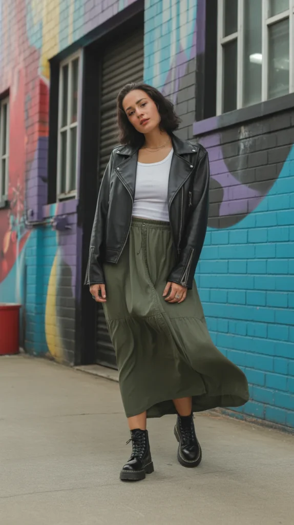 12. Army Green Long Skirt with a Black Leather Jacket and White Tank