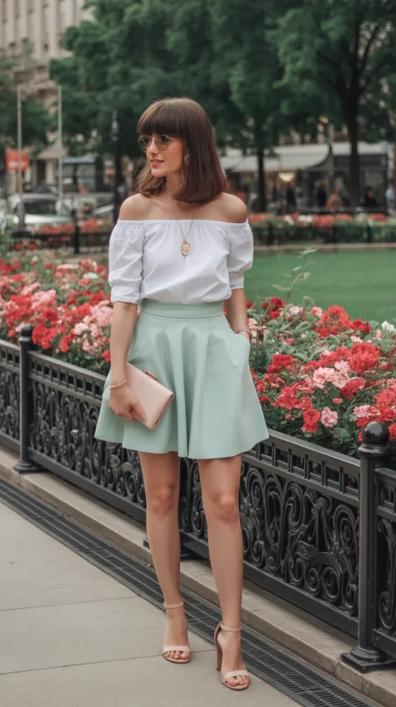 Bright, sweet, and perfect for warm days this outfit has a soft romantic feel. The off-shoulder top adds a playful touch that pairs well with the light mint tone. Nude sandals and a pastel clutch complete the look beautifully.