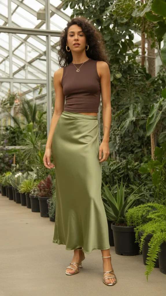 14. Olive Green Satin Maxi Skirt with a Brown Fitted Top