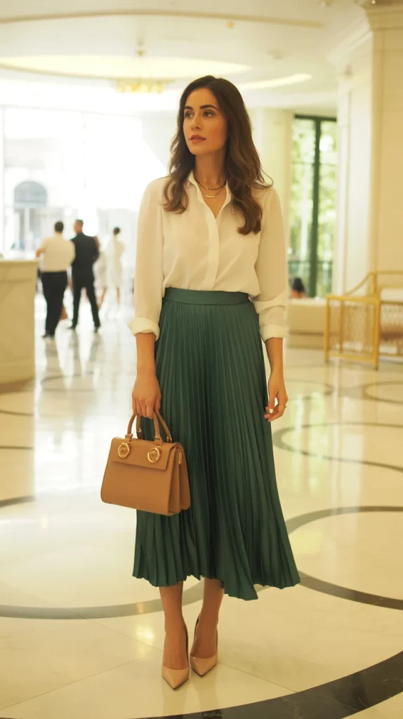 If you want something elegant but not too dressy, this combo is perfect. The emerald pleats add movement while the cream blouse keeps everything refined and balanced. Nude heels and a structured handbag pull the look together beautifully for brunch or a daytime event.
