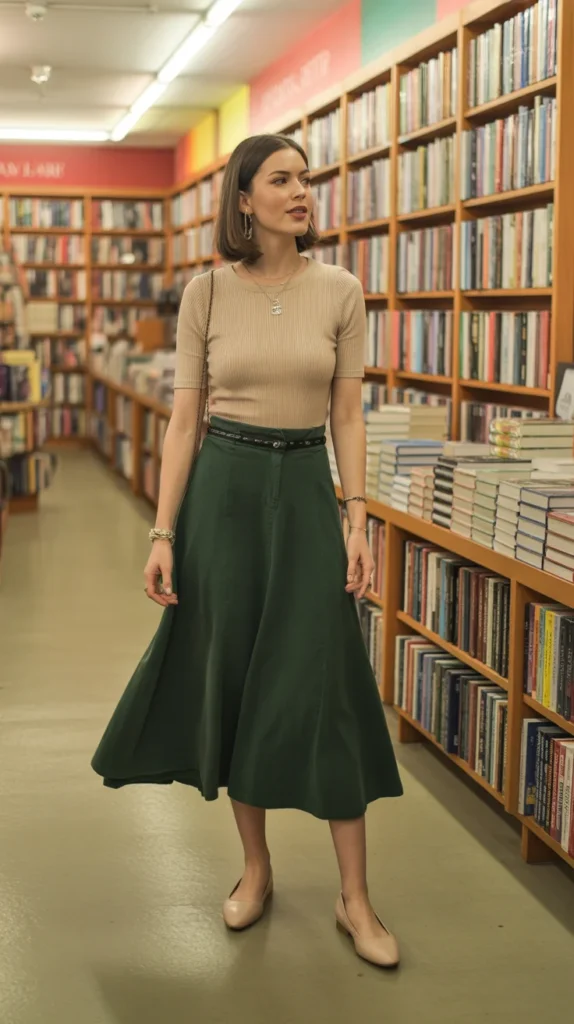 Warm neutrals pair beautifully with deeper greens, giving this outfit an understated but polished feel. The A-line shape adds a flattering silhouette without trying too hard. Ballet flats and dainty jewelry finish it with a clean, feminine touch.