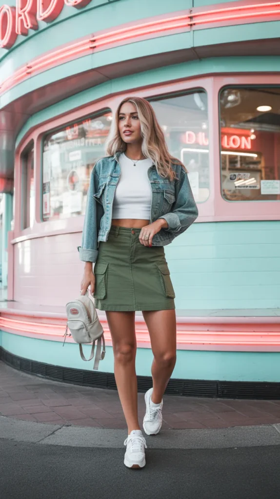 5. Army Green Cargo Mini Skirt with a White Crop Tee and Denim Jacket