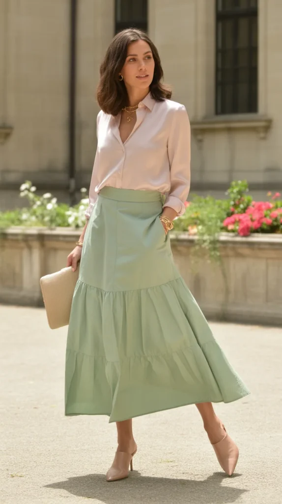 7. Mint Green Long Skirt with a Soft Pink Blouse