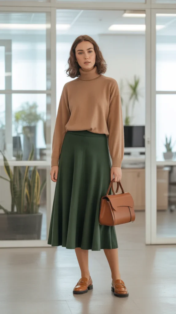 8. Forest Green Midi Skirt with a Lightweight Camel Turtleneck