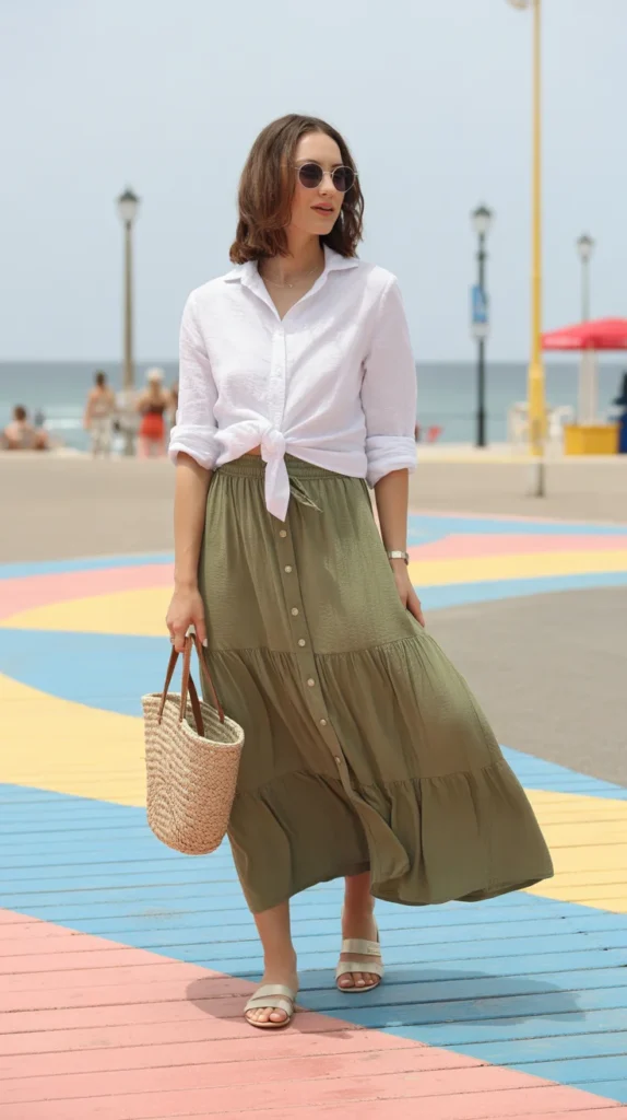 A white button-up is the easiest way to make a maxi skirt look instantly elevated. The half-tuck keeps things relaxed while still offering shape. Flat sandals and a straw bag bring a breezy charm that’s ideal for warm-weather outings.