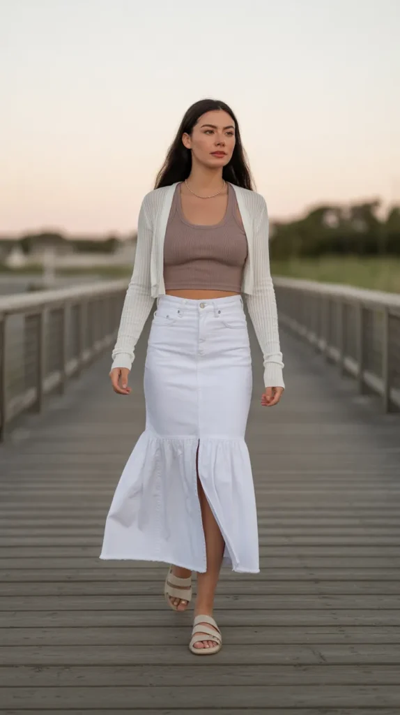 10. White Maxi Denim Skirt With a Tank Top and Cropped Cardigan