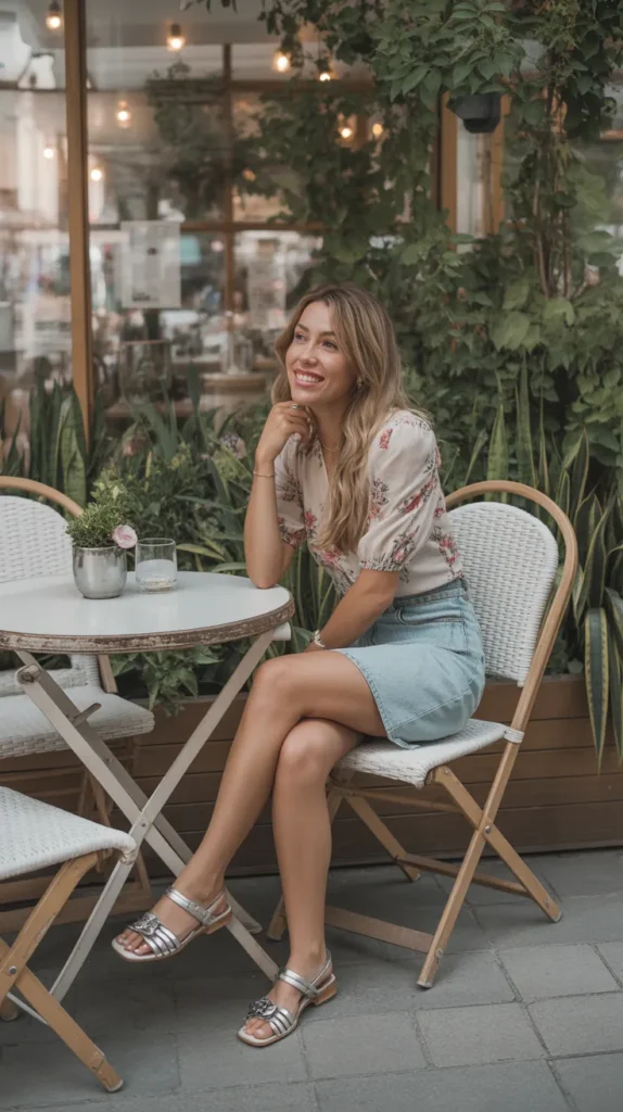 A slightly dressy girly look that works for casual evenings or brunch. Cute heeled sandals elevate the silhouette while keeping it playful.