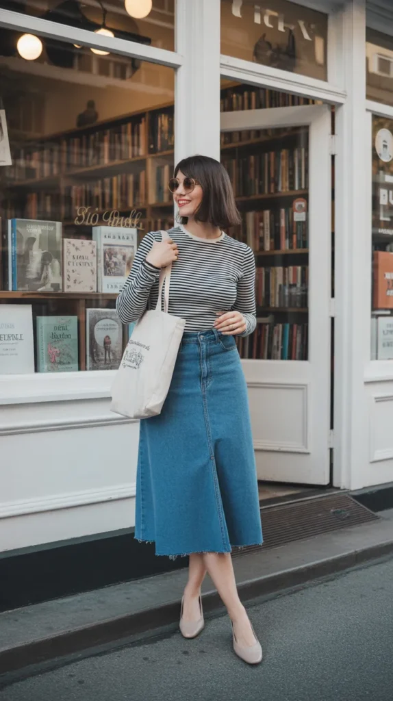 4. Midi-Length Blue Jean Skirt With a Striped Long-Sleeve Tee