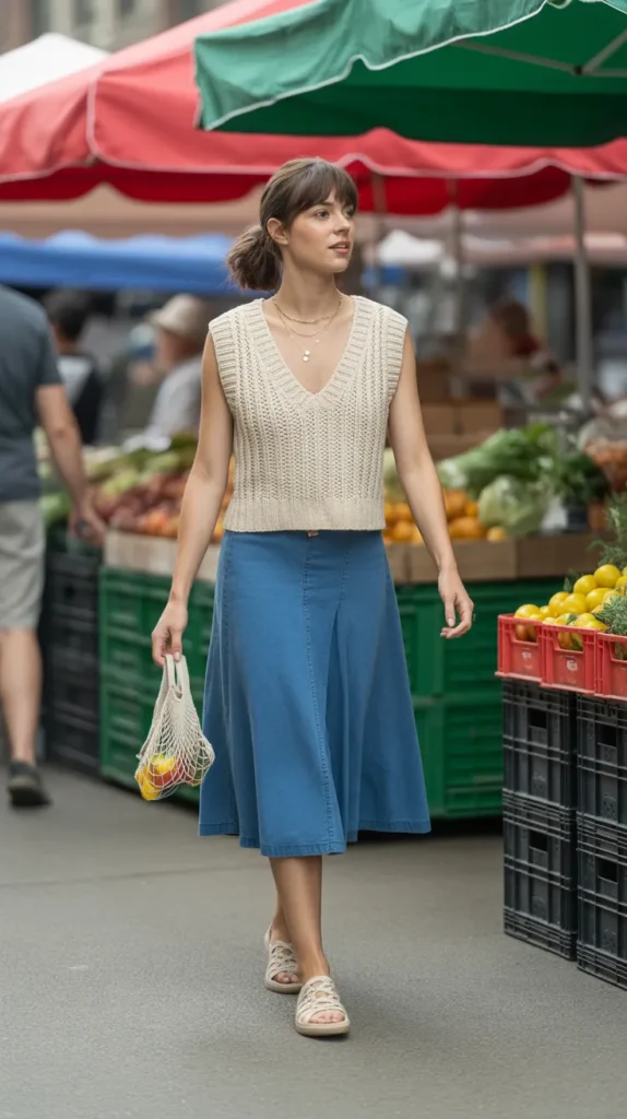 7. Blue A-Line Denim Skirt Styled With a Beige Knit Vest