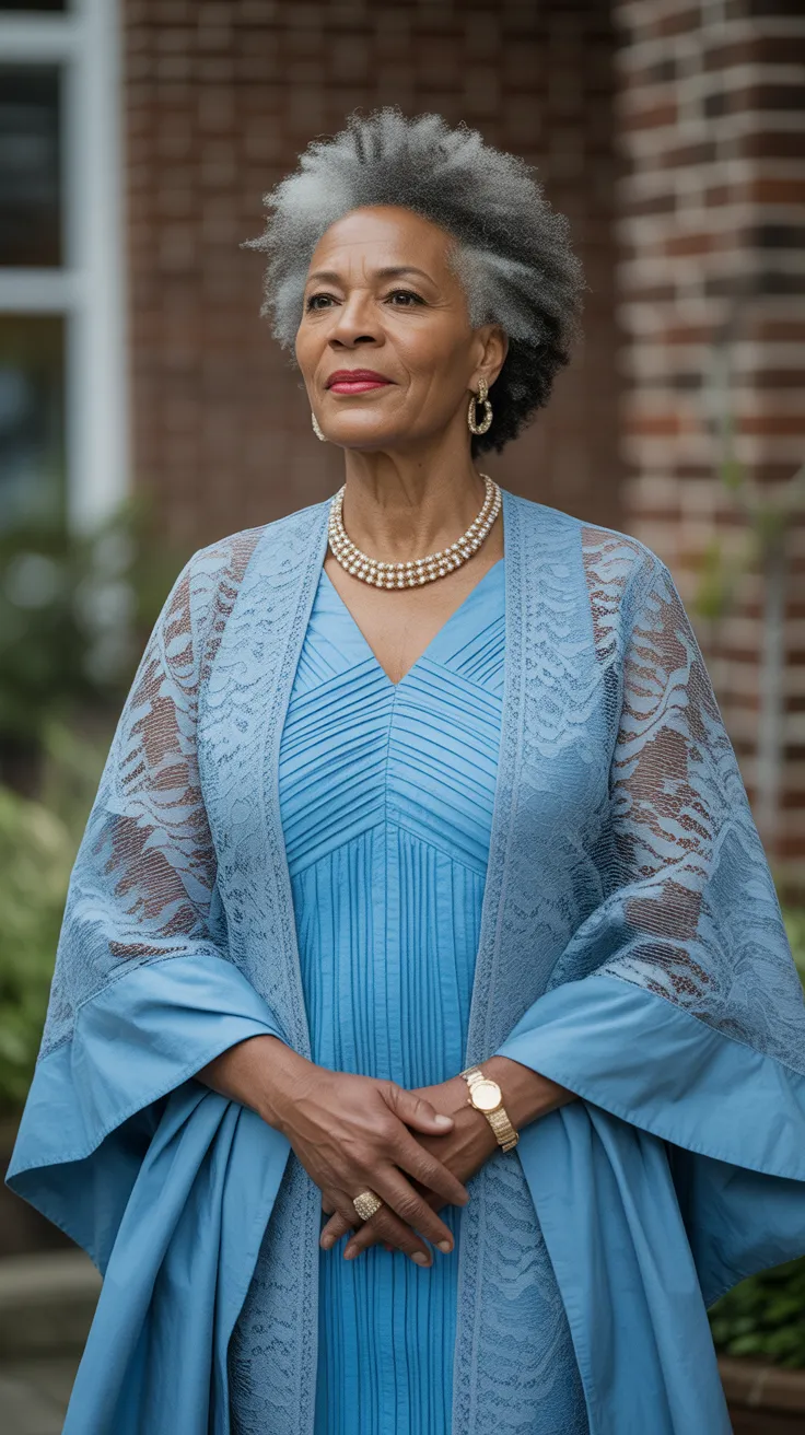 The elegant blue Kente dress with a lace overlay is a stunning choice for older women who want to showcase their style and grace. The deep blue hue is both regal and modern, making it perfect for various occasions. The lace detailing adds a touch of sophistication, elevating the overall look.