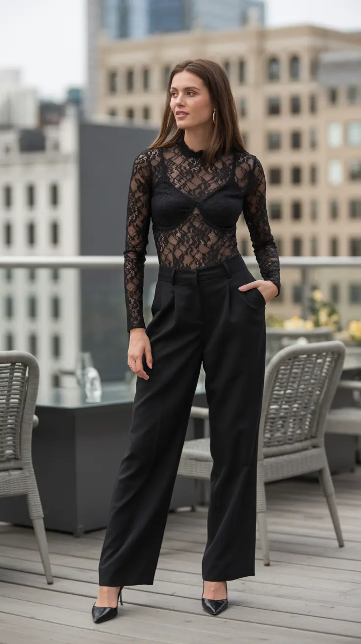 1. Black Lace Long Sleeve Top Outfit With High-Waisted Trousers