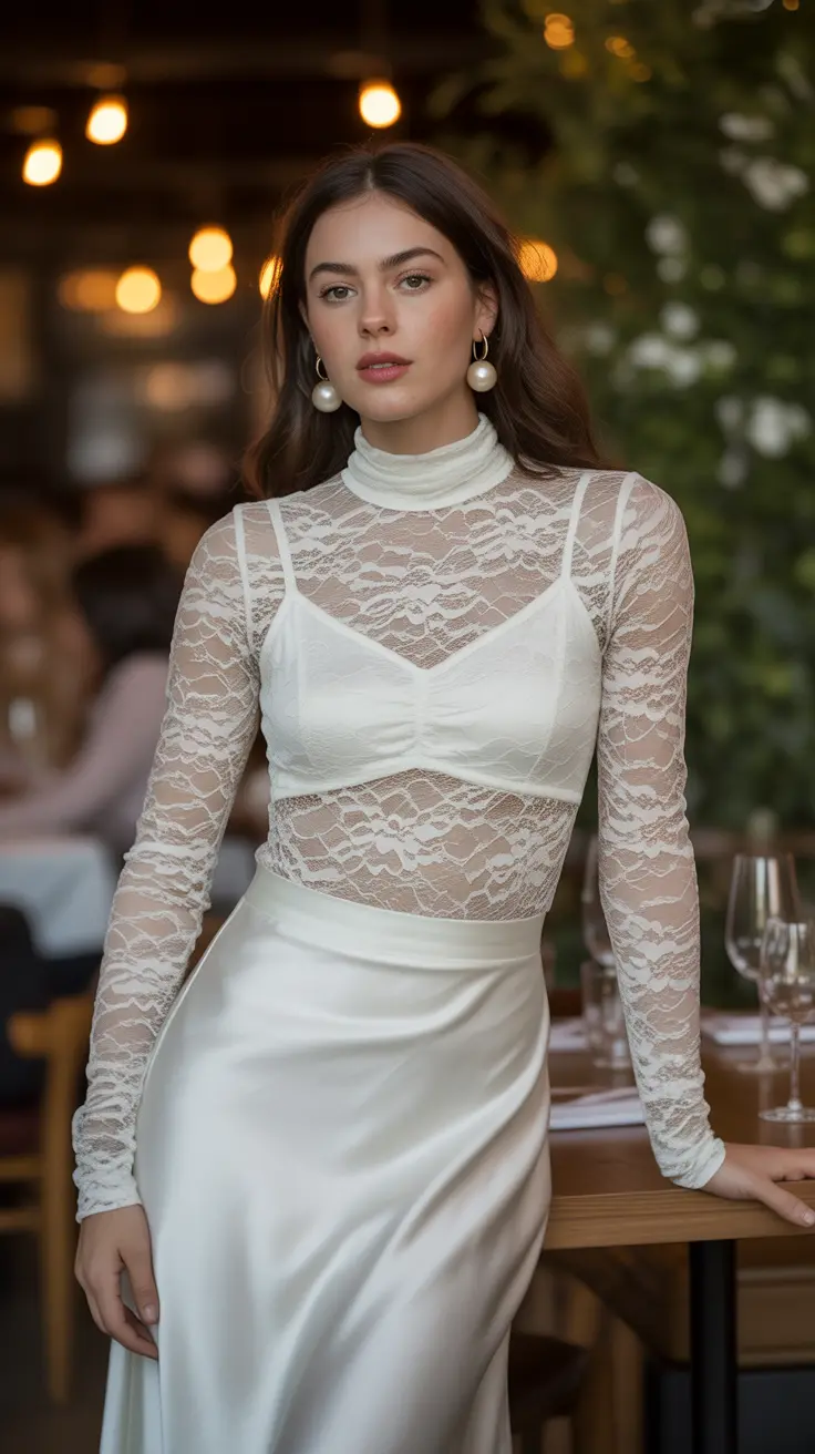This outfit combines a stunning white lace long sleeve top with a chic satin midi skirt, creating a look that is both feminine and stylish. The lace blouse adds a delicate touch, showcasing intricate patterns that draw the eye. Paired with the smooth satin skirt, the outfit balances texture and elegance perfectly.