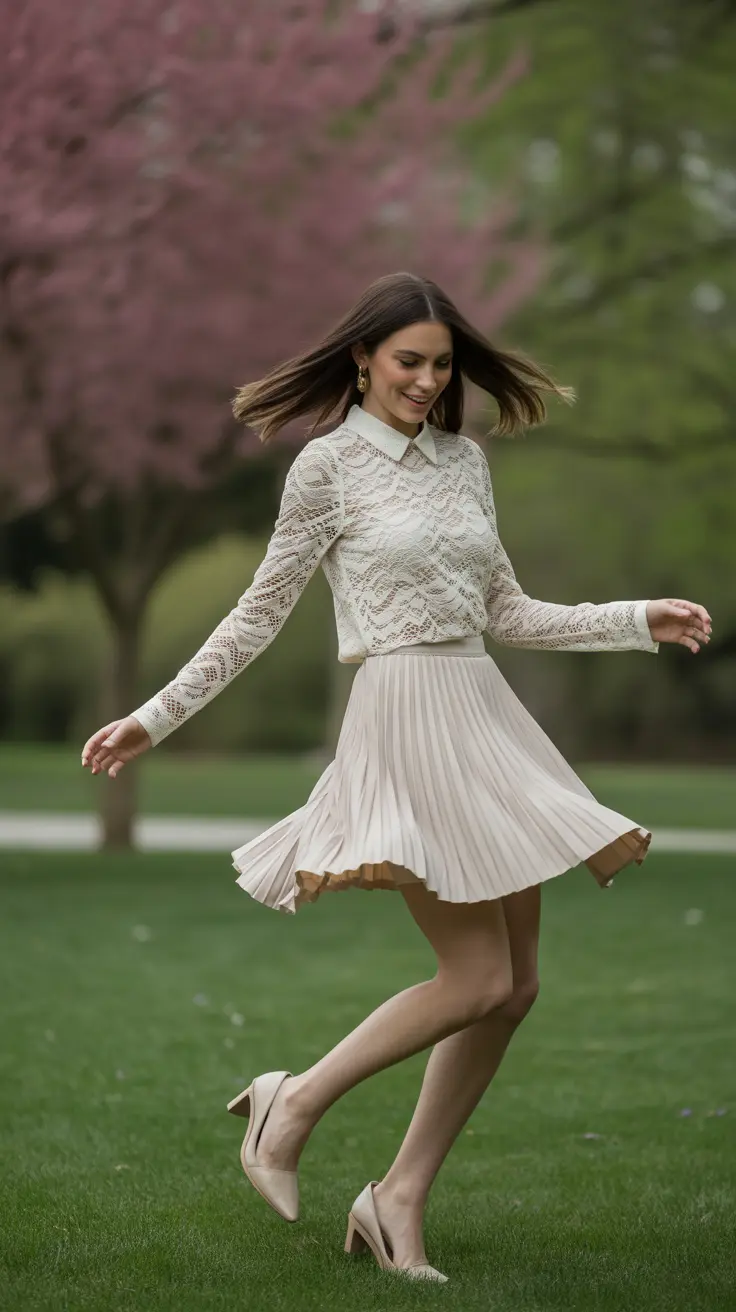 The pleated mini skirt complements the lace blouse beautifully. Its soft fabric and light color enhance the overall aesthetic, making it suitable for various occasions. Whether you’re heading to brunch with friends or a casual date, this outfit is versatile and stylish.