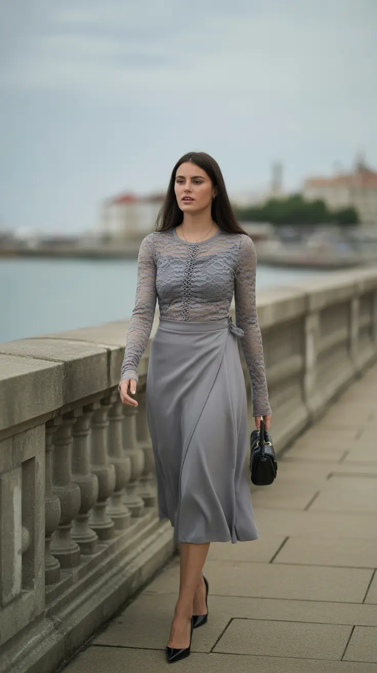 The gray lace long sleeve top paired with a midi wrap skirt creates a stunning look that is both feminine and chic. The delicate lace detailing on the blouse adds a touch of elegance, making it perfect for various occasions.