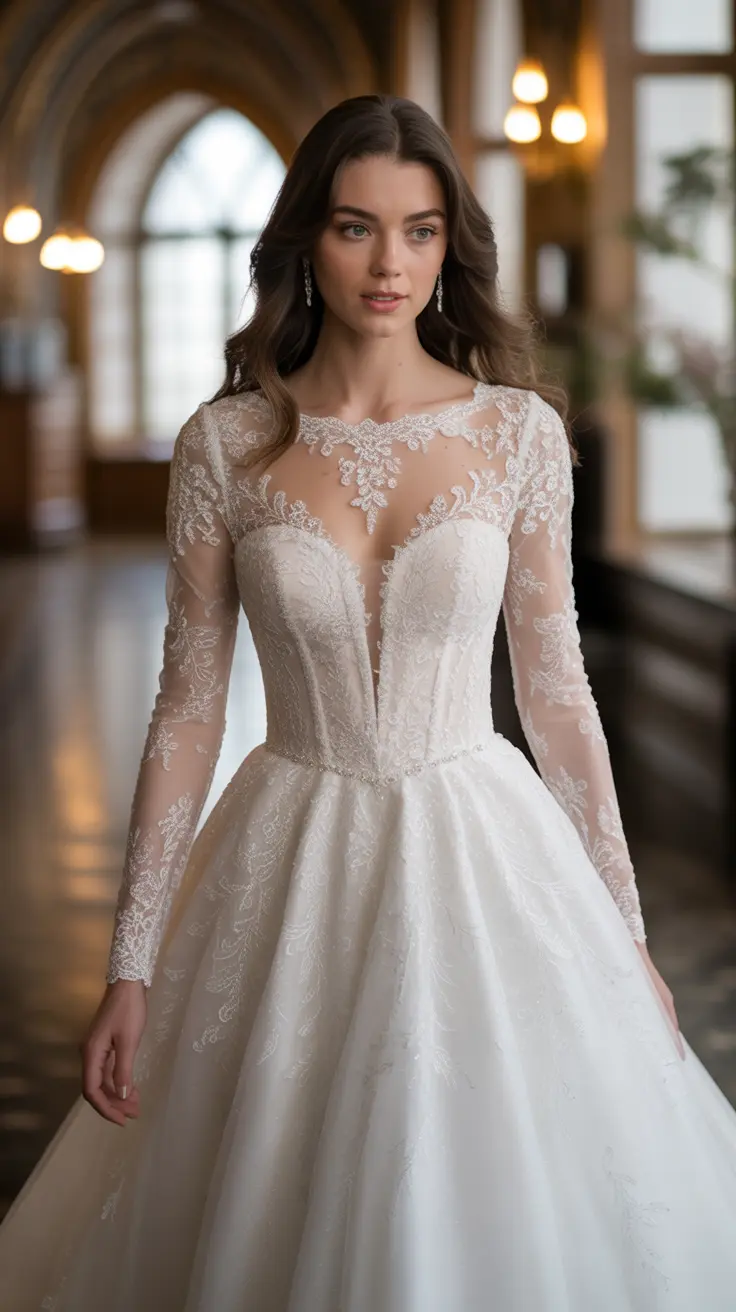 Picture a stunning long sleeve bridal gown that combines romance and elegance. The sheer lace bodice is adorned with delicate floral patterns, creating a soft and inviting look. This design highlights the beauty of lace long sleeve wedding dresses, making them a popular choice for brides seeking timeless styles.