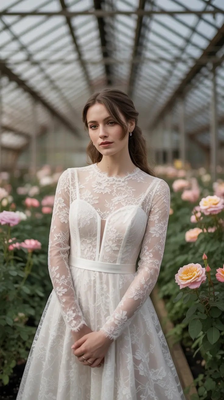 In the image, the lace long sleeve wedding dress stands out with its delicate floral patterns. The long sleeves add a touch of sophistication while keeping the look romantic. The soft tulle skirt flows gracefully, enhancing the overall elegance of the gown.