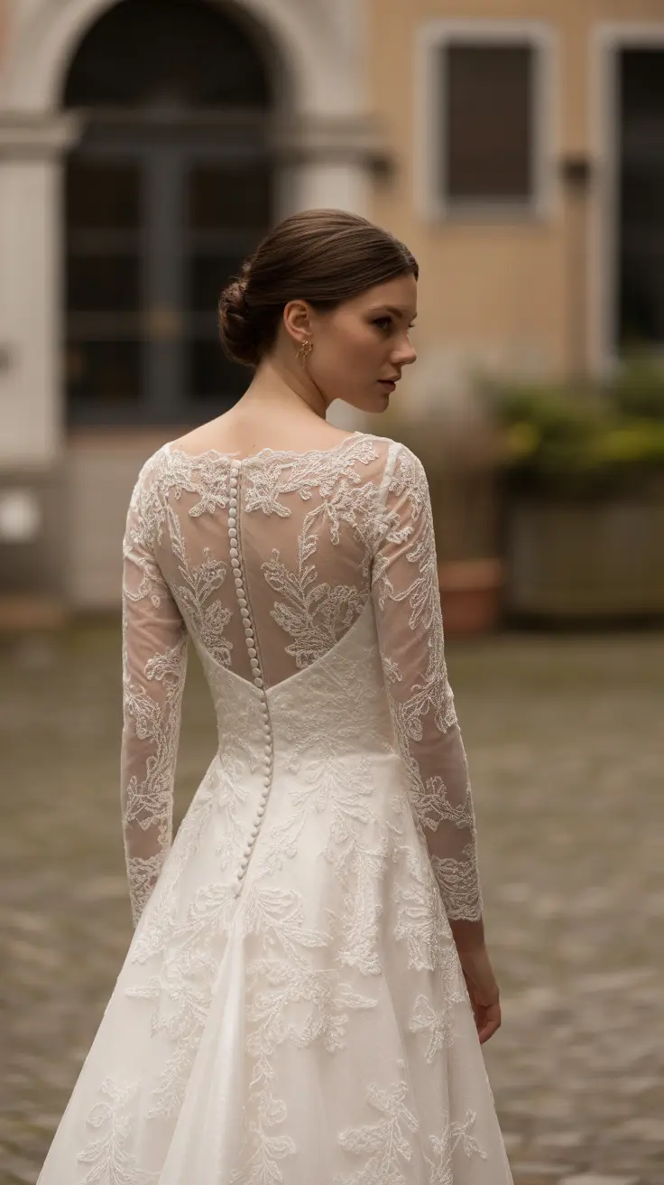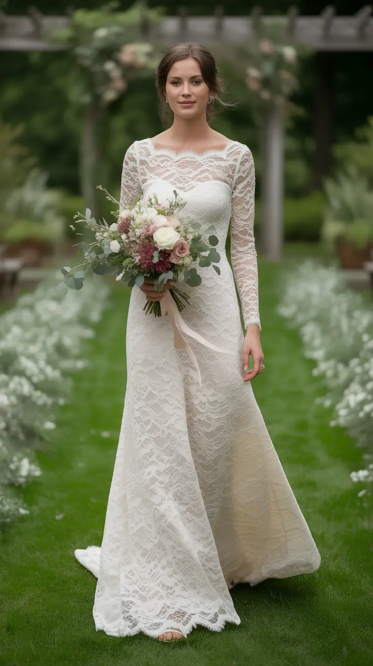When considering lace wedding dress ideas, this style stands out. The delicate lace details enhance the overall aesthetic, making it a memorable choice for your special day. Whether you’re planning a garden wedding or a grand celebration, this long sleeve bridal gown will surely turn heads.