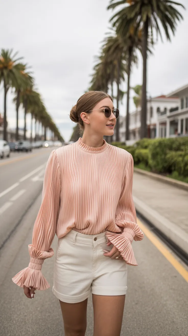 16. Peach Pleated Long Sleeve Blouse Outfit With White Shorts