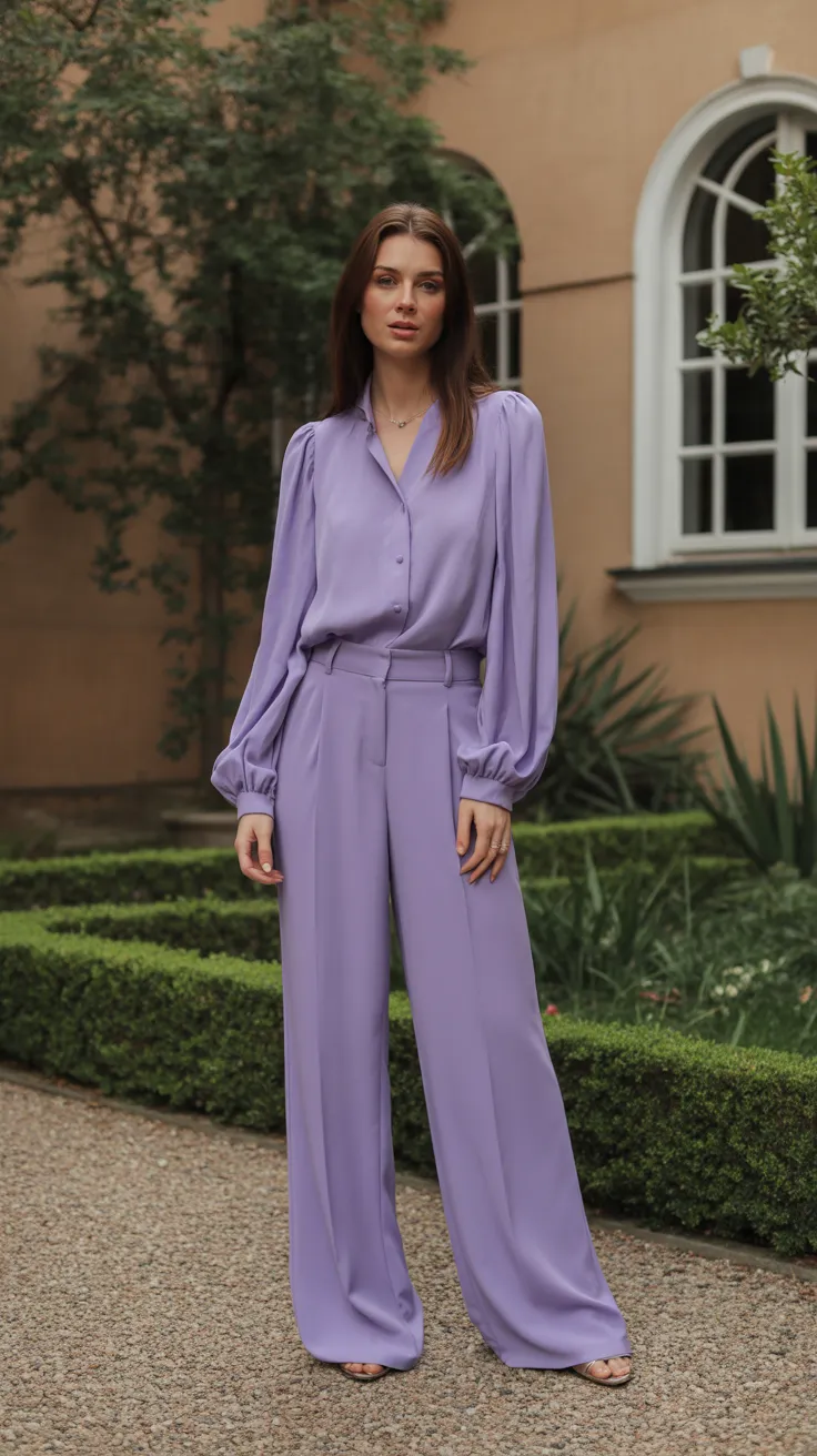 This outfit combines a lavender chiffon long sleeve blouse with chic wide-leg trousers for a polished look. The soft lavender color of the blouse adds a feminine touch, making it perfect for various occasions.