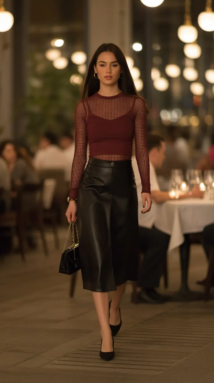 16. Dark Red Mesh Long Sleeve Top Outfit With Black Midi Skirt