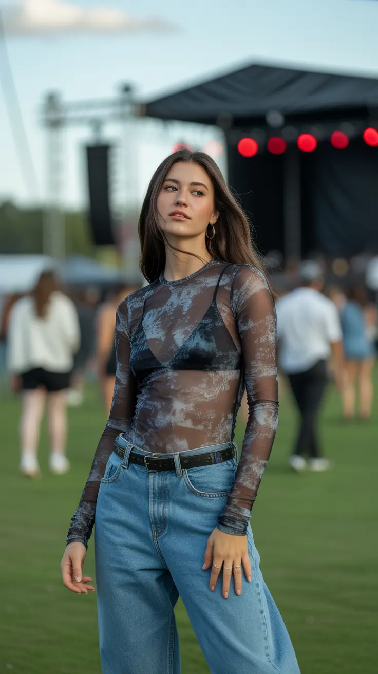 Accessorizing can elevate this look even further. Consider adding hoop earrings and some chunky sneakers for a trendy street style vibe. This outfit is not just stylish; it’s also versatile enough for different occasions. Whether you’re heading to brunch or a casual meet-up, this sheer top outfit idea is sure to turn heads.