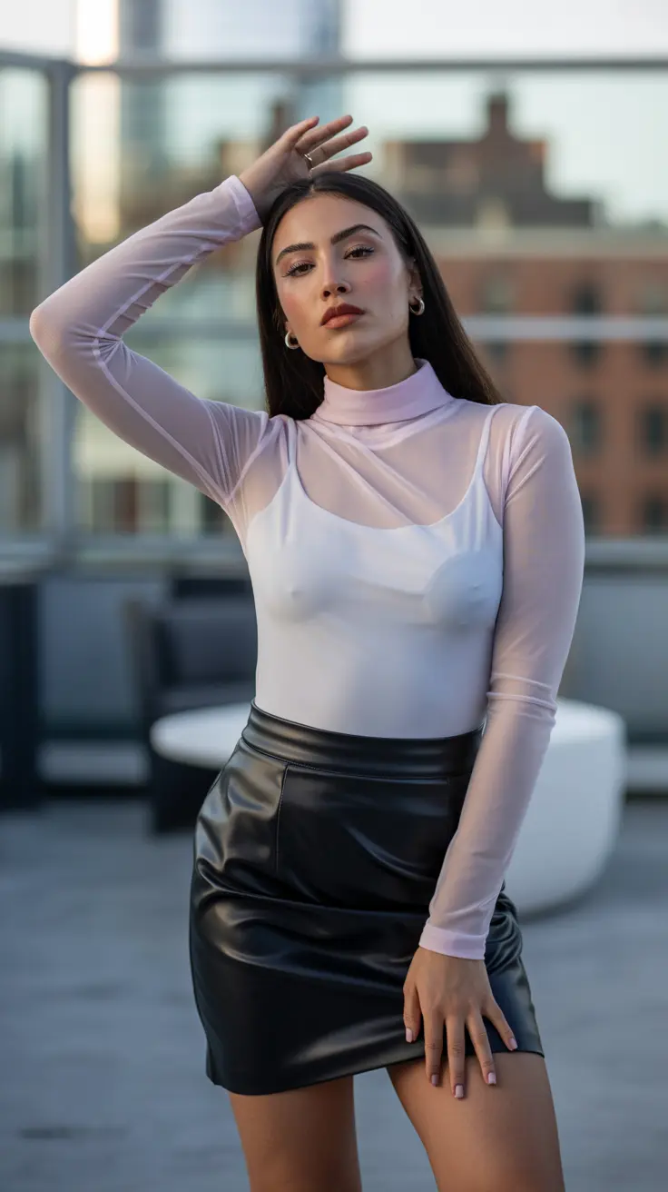 The black mesh long sleeve top paired with leather pants creates a striking look that’s both edgy and trendy. The sheer top adds a hint of allure, making it perfect for a night out or a stylish day in the city.