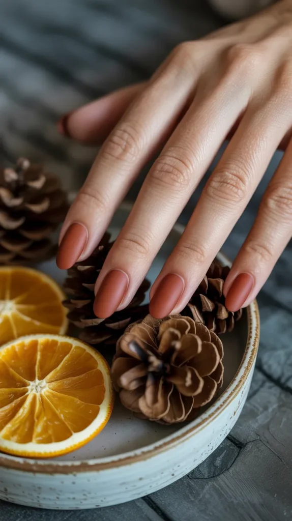 Matte terracotta nails radiate rustic charm. The warm clay hue feels natural and soothing, making it a must-try November nails color. It’s earthy, modern, and beautifully pairs with soft sweaters. 🍂