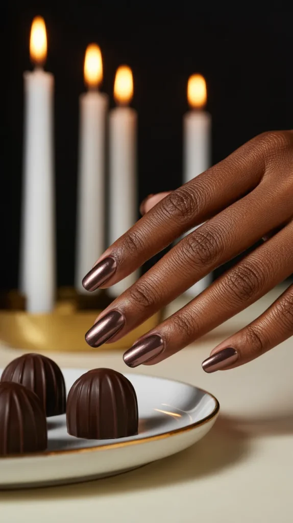 Chocolate chrome nails finish the look with a touch of metallic luxe. The molten brown tone glows softly, giving your nails for winter the perfect blend of warmth and glam. It’s a chic finale for your November aesthetic. 🍫