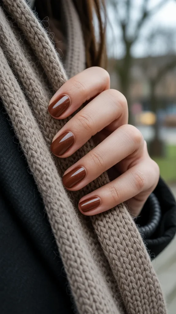 Rich and timeless, chestnut brown nails bring classic polish to cold-weather days. The sleek, glossy finish adds instant sophistication to your nails for winter look. Pair them with gold jewelry or soft knits for that perfect November balance. 🤎