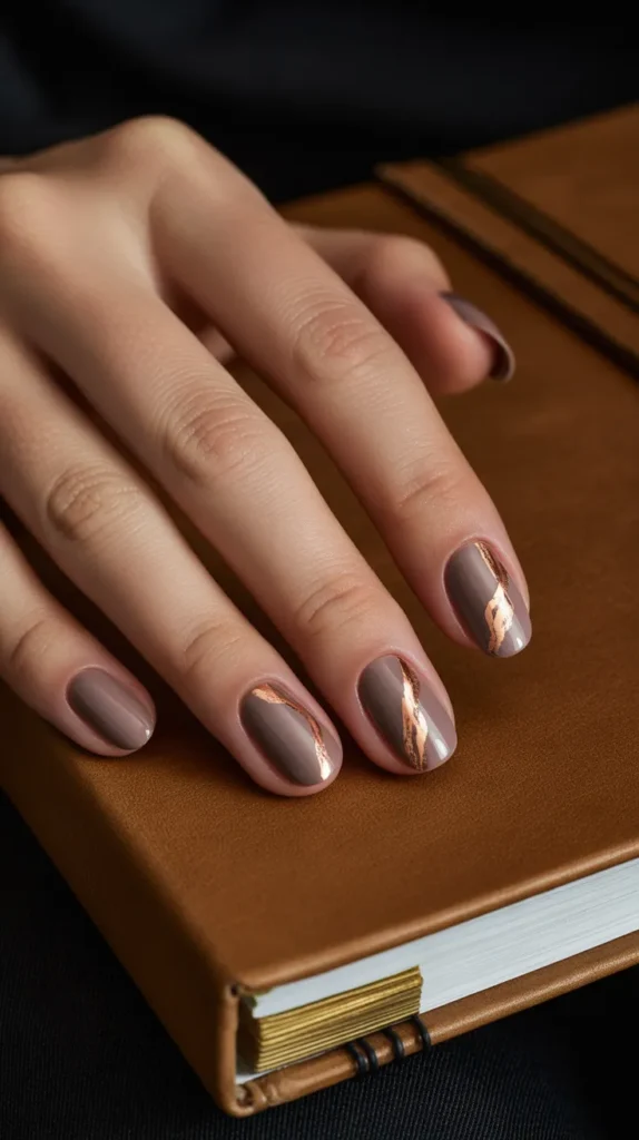 Copper foil nails bring warmth and shine in equal measure. The taupe base with delicate metallic foil gives a soft, radiant touch a must-try for nails winter metallic trends. Elegant yet easy to wear for any occasion. ✨