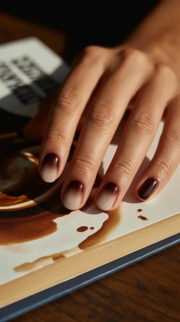 Espresso fade nails mix warmth and contrast beautifully. The ombré blend from deep espresso to latte beige feels smooth and comforting. A stylish winter nails choice that’s rich yet refined. ☕