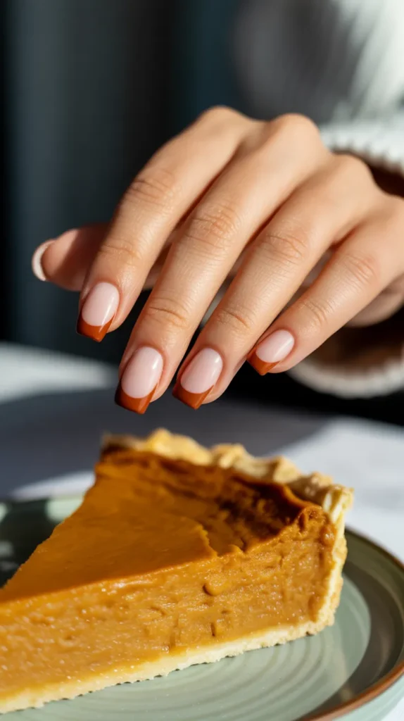 Burnt orange French tips add a seasonal twist to a timeless classic. The nude base and warm tips bring subtle color that perfectly fits the November nails palette. They’re cheerful without being bold simple and chic. 🍁