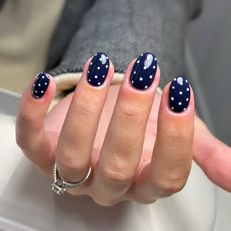 9. Navy Blue Polka Dot Nails With Playful Minimal Style