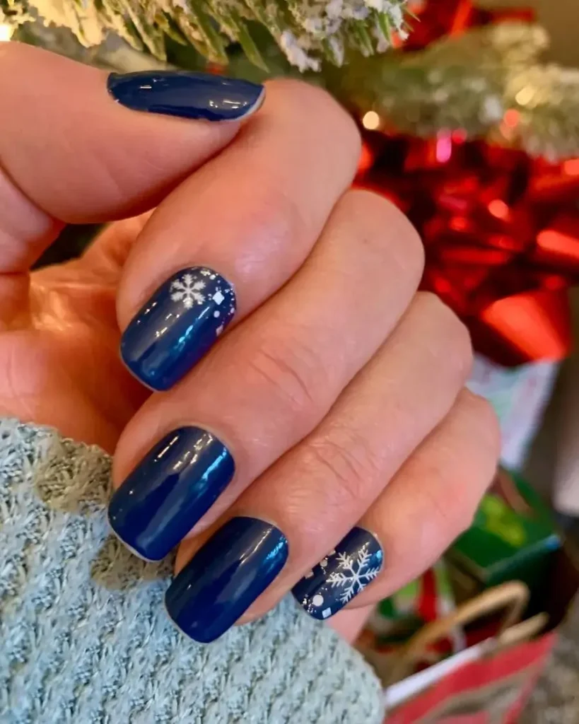 19. Festive Navy Blue Nails With Snowflake Accent Art