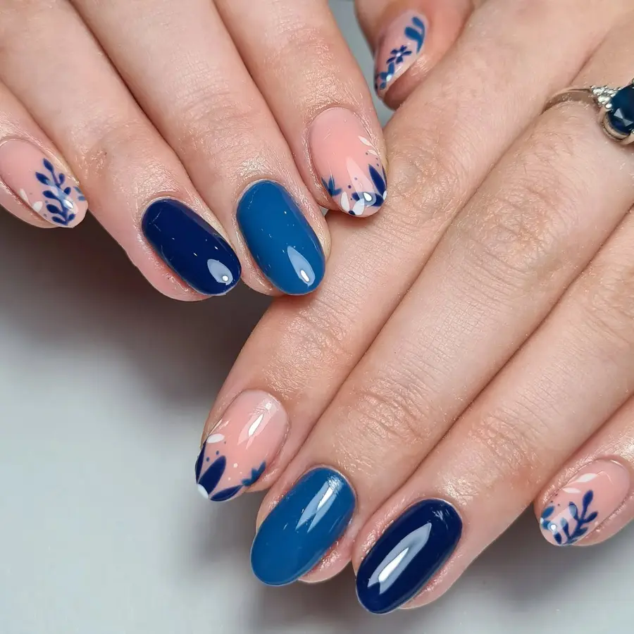 7. Navy Blue Floral Accent Nails With Soft Nude Base