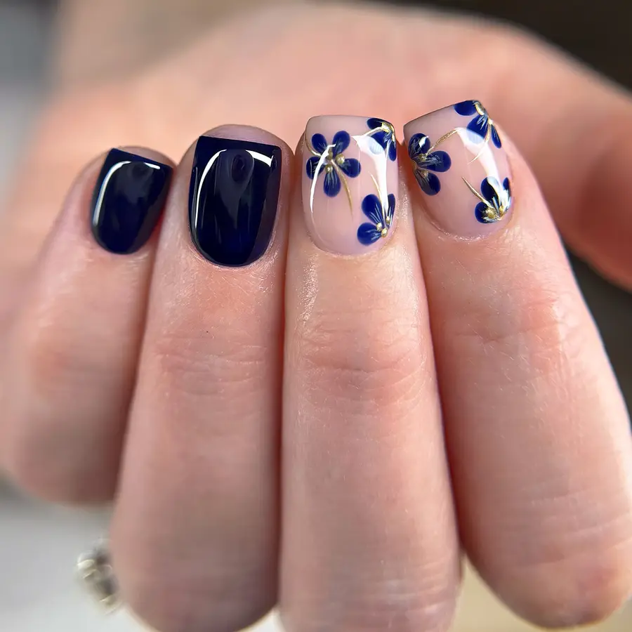 2. Navy Blue Floral Accent Nails With Soft Nude Base