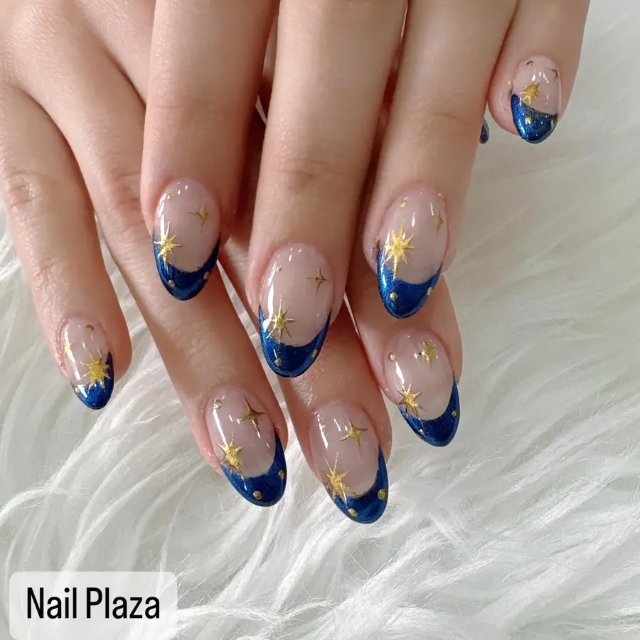 4. Navy Blue Star French Tip Nails With Gold Accents