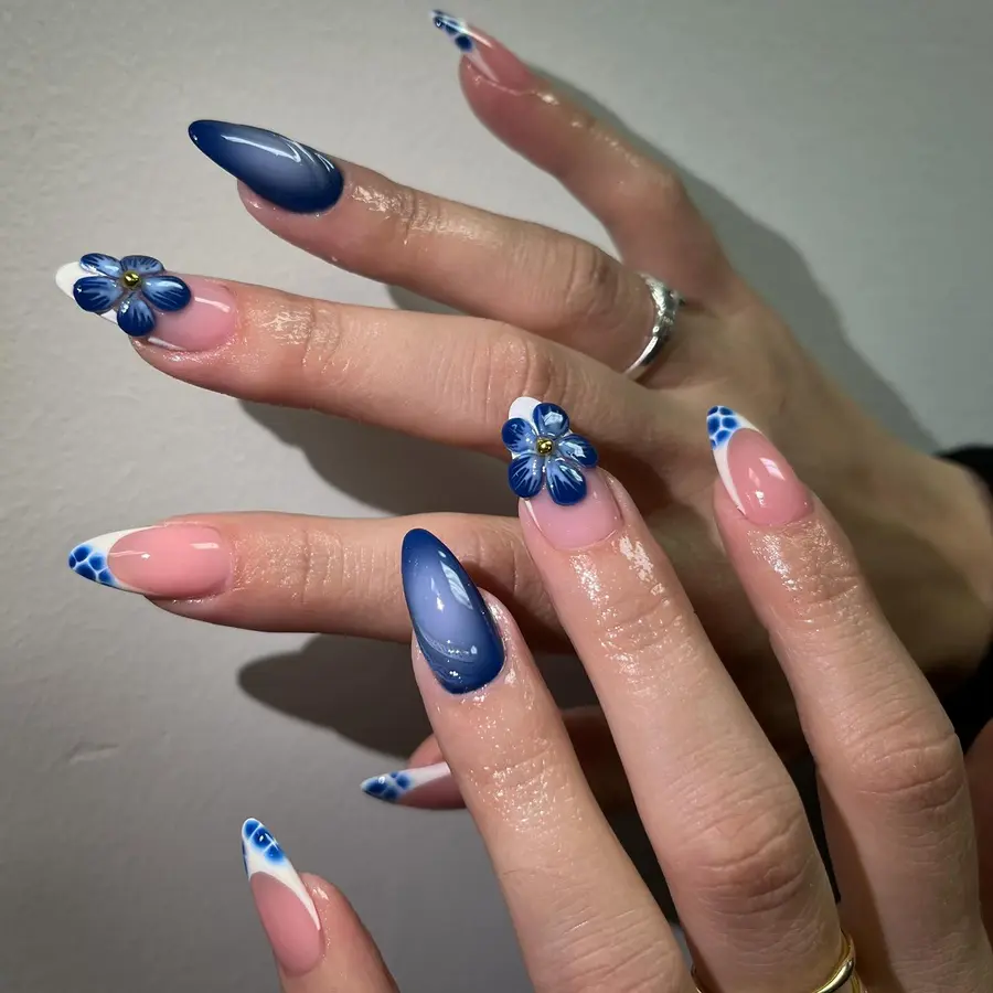11. Glossy Navy Blue Ombre Nails With Soft Floral Accents