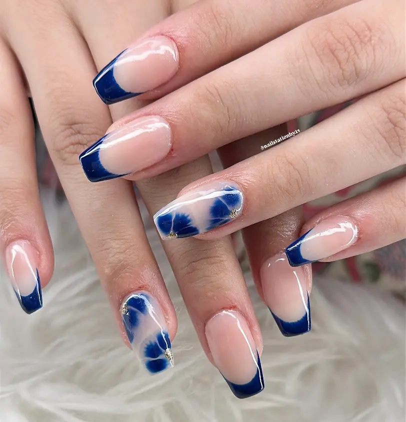 A beautiful mix of deep navy blue and soft nude creates a balanced, wearable manicure. Delicate blue floral accents add a gentle decorative touch without overpowering the look. This style feels elegant, fresh, and perfect for everyday nails blue lovers who still want a hint of detail.