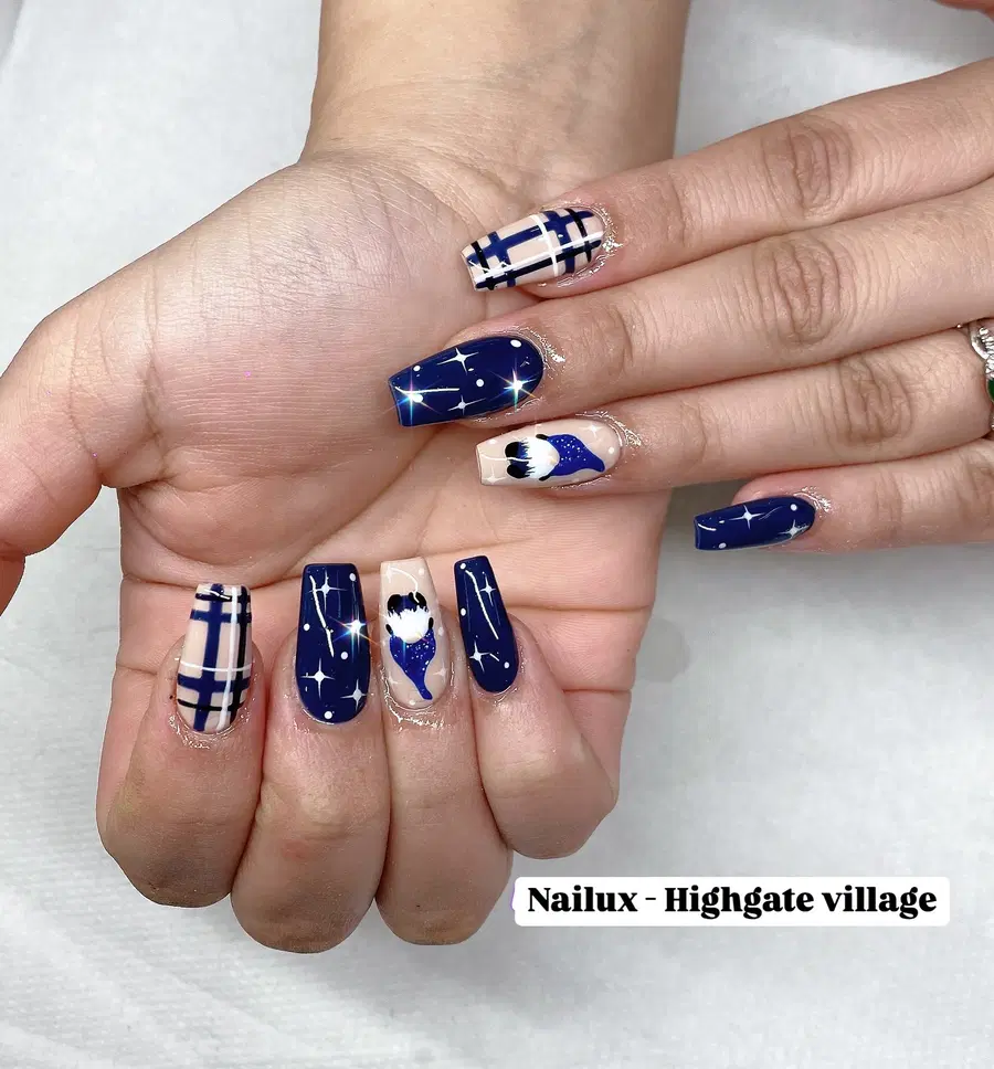This bold navy blue nail set blends glossy dark blue polish with plaid patterns, starry galaxy accents, and detailed character art. The mix of textures and designs creates a playful yet polished look that stands out beautifully. Ideal for statement lovers who want nails blue designs with personality and depth.